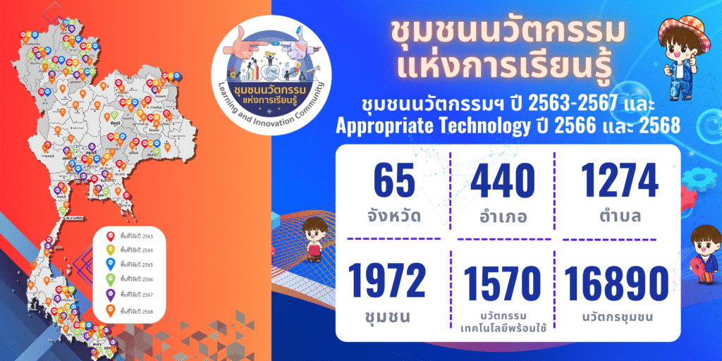 ในระยะ 5 ปี ที่ผ่านมา ตั้งแต่ปีงบประมาณ 2563 – 2567 หน่วย บพท. ได้สนับสนุนทุนวิจัยและนวัตกรรมในแผนงาน “ชุมชนนวัตกรรมเพื่อการพัฒนาอย่างยั่งยืน” และกรอบการวิจัยขยายผลเทคโนโลยีที่เหมาะสม (Appropriate Technology) เพื่อ boost up ชุมชน ผ่านการขยายผลวิจัยเทคโนโลยีที่เหมาะสมของโครงการวิจัยที่ได้รับสนับสนุนผ่านแพลตฟอร์มชุมชนนวัตกรรม โดยอาศัยการทำงานของหน่วยงานเครือข่ายกระทรวงการอุดมศึกษาวิทยาศาสตร์ วิจัยและนวัตกรรม (อว.3สถาบัน/หน่วยงาน จากผลการดำเนินงานวิจัยทำให้เกิดชุมชนนวัตกรรมมากถึง 808 ตำบล ครอบคลุม 1,228 ชุมชน กระจายในพื้นที่ทั่วประเทศ 44 จังหวัด 306 อำเภอ เกิดการสร้างนวัตกรชุมชนจำนวน 10,008 คน มีเทคโนโลยีและนวัตกรรมพร้อมใช้รวมทั้งนวัตกรรมกระบวนการเพื่อแก้ไขปัญหาที่สำคัญของชุมชนจำนวน 1,272 นวัตกรรม/เทคโนโลยี ที่ใช้ยกระดับอัตราการเติบโตของมูลค่าเศรษฐกิจฐานรากและมูลค่าสินค้าผลิตภัณฑ์ชุมชนเพิ่มขึ้นร้อยละ 10-20 อีกทั้งยังเกิดการนำนวัตกรรมเข้าสู่การทำแผนพัฒนาตำบล/ท้องถิ่น โดยผ่าน Learning and Innovation Platform (LIP) เกิดการสร้างระบบฐานข้อมูลเทคโนโลยี/นวัตกรรมพร้อมใช้ (Technology and Innovation Library) และการสร้างระบบฐานข้อมูลนวัตกรชุมชน