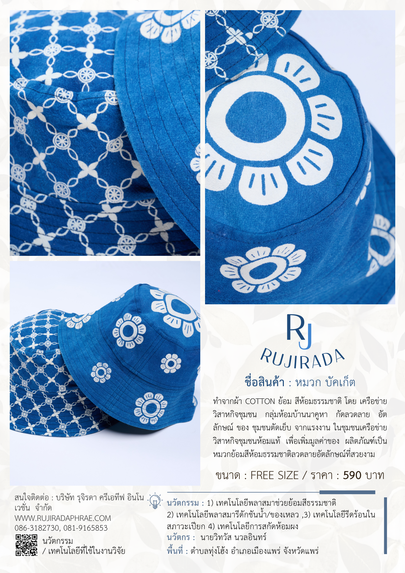 ทำจากผ้า Cotton ย้อม สีห้อมธรรมชาติ โดย เครือข่าย วิสาหกิจชุมชน กลุ่มห้อมบ้านนาคูหา กัดลวดลาย อัตลักษณ์ ของ ชุมชนตัดเย็บ จากแรงงาน ในชุมชนเครือข่ายวิสาหกิจชุมชนห้อมแท้ เพื่อเพิ่มมูลค่าของ ผลิตภัณฑ์เป็นหมวกย้อมสีห้อมธรรมชาติลวดลายอัตลักษณ์ที่สวยงาม